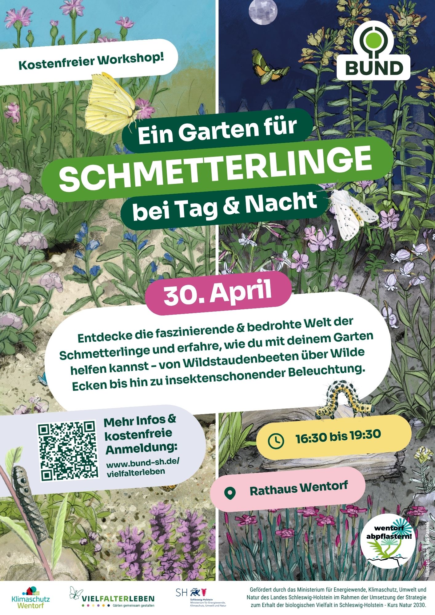 Los geht es um 16:30 Uhr am Wentorfer Rathaus. Nach einem kurzen, anschaulichen Einstieg nimmt Lena Winkelmann vom Projekt „VielFALTERleben“ die Teilnehmenden mit in die faszinierende Welt der Tag- und Nachtfalter. Im Anschluss wird gemeinsam praktisch gearbeitet: Hinter dem Rathaus entsteht Schritt für Schritt ein Wildstaudenbeet, das Schmetterlingen Nahrung und Lebensraum bietet. Der Workshop ist kostenfrei und offen für alle Interessierten. Da die Plätze begrenzt sind, wird um eine Anmeldung gebeten.